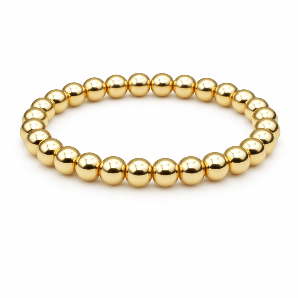 Goudkleurige armband met grote 8 mm 14 kt vergulde kralen. Mooie opvallende basic. Leuk om alleen te dragen, met een ander dun armbandje erbij of juist in een hele set.