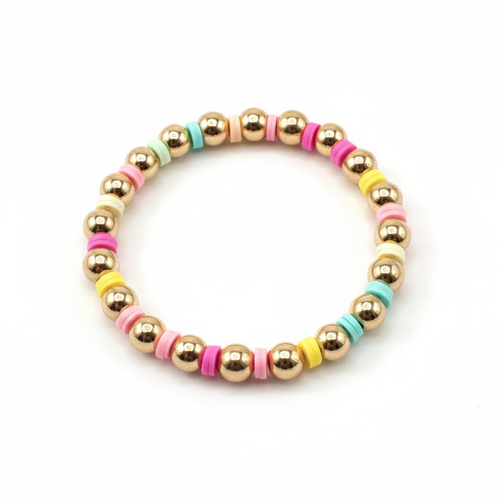 Steel de show deze zomer op een terras, een festival of maak zelfs je werkoutfit feestelijk! Deze elastische multicolor armband met 8mm 14 kt vergulde kralen en kleuraccenten van kleikralen maakt elke outfit een feestje!