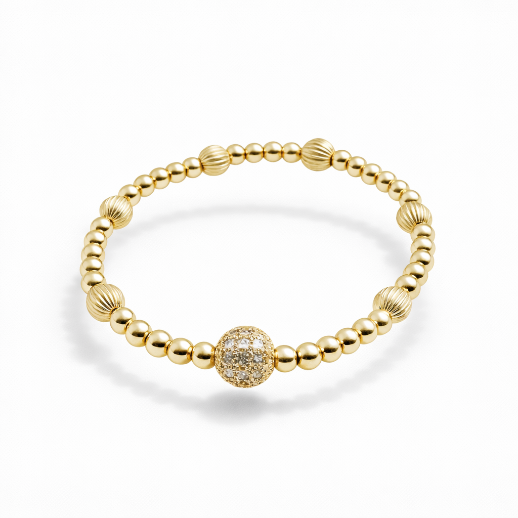 Wat een mooie armband! Handgemaakt met 14 kt gold plated 4 mm kraaltjes, 8 mm geribbelde gold plated kralen en een 8 mm gold plated accentkraal met zirconia’s.