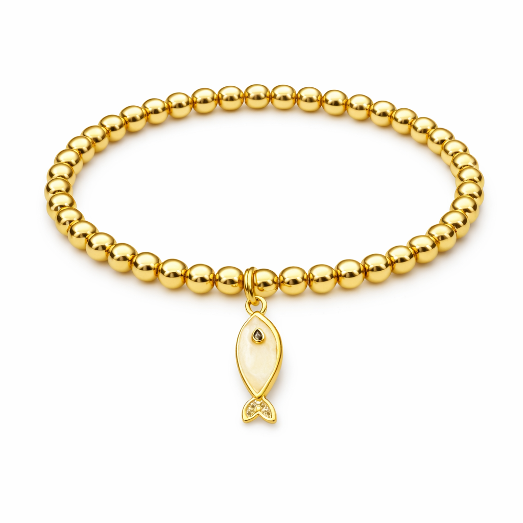 Mooi goudkleurig armbandje met een gebroken wit visje. Bestaat uit 4 mm 14 kt vergulde kralen met een 18 kt vergulde emaille bedel.