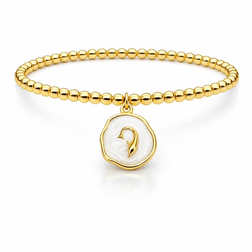 Goudkleurig armbandje van 4 mm 14 kt vergulde kraaltjes met emaille dolfijn bedel.