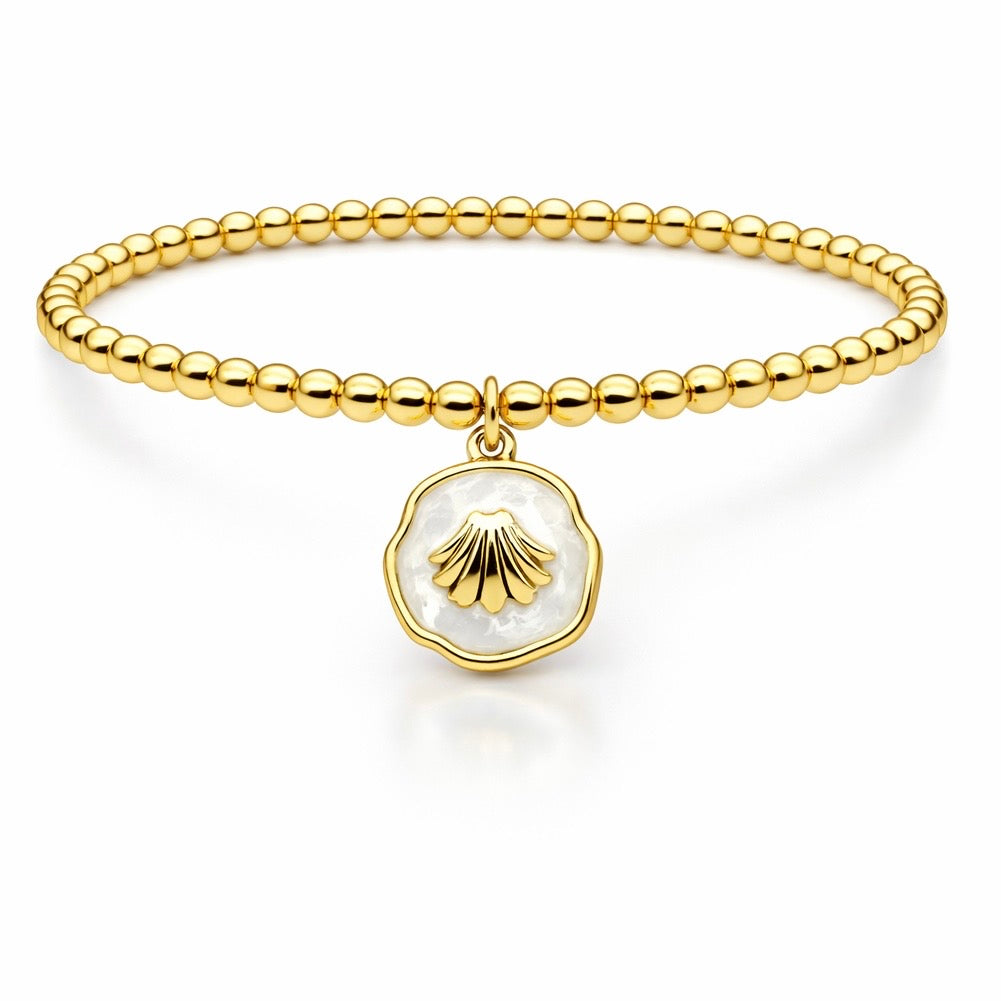 Goudkleurig armbandje van 4 mm 14 kt vergulde kraaltjes met schelp emaille bedel.