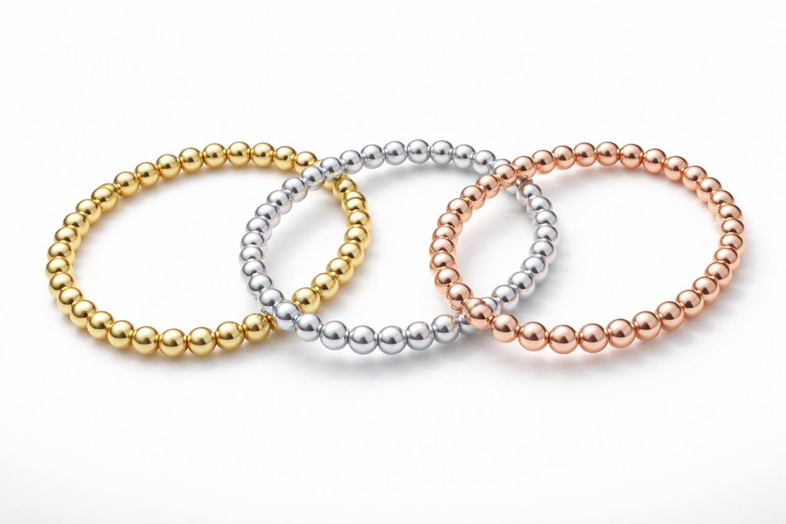 Een Mix & Match set helemaal on trend waar jij de hele dag mee kan stralen! Drie armbanden met 6 mm vergulde kralen in rose-, zilver-, en goudkleur.